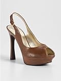 Who says flare is only for jeans? Peep toe sling back features a flare shaped heel. Adjustable side closure. 1 ¼" platform 5" high heel Material: Black- Leather Natural- Leather Leopard- Patent Women's Shoes > Dress Read more